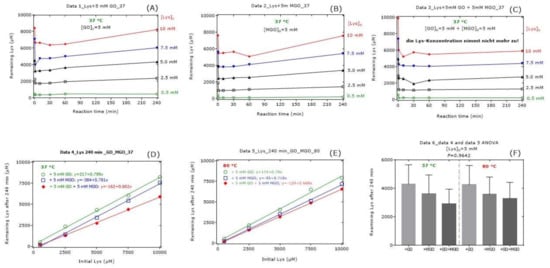 Remaining Lys concentration in reaction mixtures of Lys, GO and MGO incubated for 37 °C and 80 °C. All experiments were performed in independent triplicates. For the sake simplicity, only the mean values were plotted in (A–E). In (F), data are presented as mean with standard error of the mean. Linear regression analysis was performed between remaining Lys concentration (y) and initial Lys concentration (x). See also Table 1, Table 2, Table 3, Table 4, Table 5, Table 6 and Table 7.