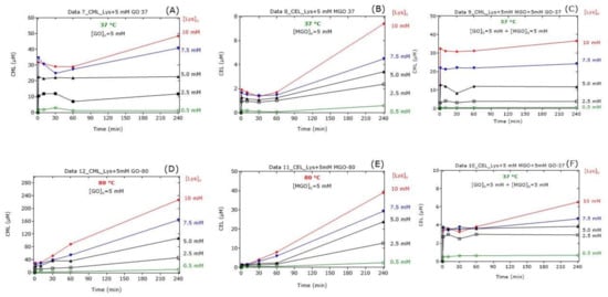 In the Lys-containing reaction mixtures, GO or MGO resulted in sudden increases in the CML and CEL concentrations, respectively, in dependence on the initial Lys concentration (Figure 4). At 37 °C, the CML and CEL concentrations were relatively constant for the first 60 min and increased thereafter, with the CEL concentrations increasing more strongly. At 80 °C, the CML and CEL concentrations increased almost linearly with reaction time to reach higher concentrations compared to 37 °C. In the Lys-, GO- and MGO-containing reaction mixtures, the addition of Lys resulted in sudden increases in the CML (Figure 4C) and CEL (Figure 4F) concentrations in dependence on the initial Lys concentration, yet almost independent of the reaction time. In the co-presence of GO and MGO, the formation of CML (Figure 4C) and CEL (Figure 4F) from Lys was almost independent of the reaction time after the first minute of the reaction.