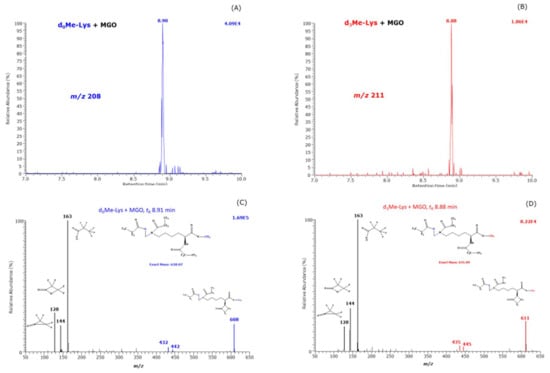 In addition, the reaction products were analyzed by scanning (m/z range, 50 to 650) in order to test formation of other reaction products besides CML and CEL. We observed a peak eluting at about 8.9 min only in the samples that contained MGO both in the absence and in the presence of H2O2 suggesting independency of H2O2. The extracted ion chromatograms and the mass spectra of these reaction products are shown in Figure 5. They are very similar to those of d,l-5-hydroxy-lysine []. The mass fragments at m/z 128, m/z 144 and m/z 163 are common to d0Me-Lys and d3Me-Lys derivatives and indicative of a hydroxy-derivative. The largest mass fragments were observed at m/z 608 and m/z 611 indicative of unlabeled and trideuteromethyl monoesters, respectively. The mass fragments at m/z 608 and m/z 611 are most likely formed from a neutral loss of 20 Da due to HF ([M−HF]−). Such a fragmentation is very common in Nε-pentafluoropropionyl derivatives of ε-amino acids []. The [M−HF]− ions in the Me-PFP derivatives of d,l-5-hydroxy-lysine are m/z 594 for d0Me and m/z 597 for d3Me, i.e., by a methylene group (CH2, 14 Da) smaller. The retention times and the mass spectra of the Me-PFP derivatives of the new reaction suggest that this reaction product is presumably Nε-(hydroxymethyl)-lysine methyl ester. The retention times of the Me-PFP derivatives of d,l-5-hydroxy-lysine were 8.54 min and 8.66 min []. The slightly longer retention time of the Me-PFP derivative of 8.9 min is presumably in part due to the additional methylene group in Nε-(hydroxymethyl)-lysine methyl ester.