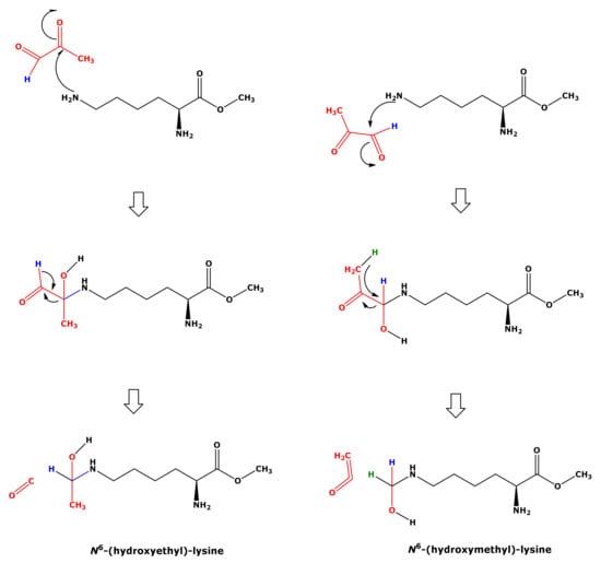 Our study revealed, for the first time, strong evidence of the formation of hydroxymethyl-lysine (HML) in reaction mixtures of Lys and MGO. First, semi-quantitative analyses using d,l-5-hydroxy-lysine as a surrogate internal standard suggest that HML is formed at higher yields than CML and CEL. HML is rarely reported in the literature, mostly in the context of formyl-lysine [] and hydroxylation of histone-derived monomethyl-lysine []. Synthetic HML was found to be a source of bioavailable Lys in ruminants []. HML can be easily obtained by the reaction of Lys with formaldehyde in Ca(OH)2-containing aqueous solution []. MGO is considered to form spontaneously formaldehyde and acetaldehyde []. In our study, we did not test this possibility. Due to the presumably large number of chemically reactive species from decomposed, hydrated or polymerized MGO [], other reactions in Lys- and MGO-containing aqueous solutions may also occur.