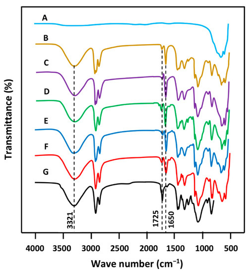 FTIR spectra of: (A) TiO2 nanoparticles, (B) PEVAL/TiO2-5, (C) PEVAL/TiO2-4, (D) PEVAL/TiO2-3, (E) PEVAL/TiO2-2, (F) PEVAL/TiO2-1and (G) pure PEVAL.