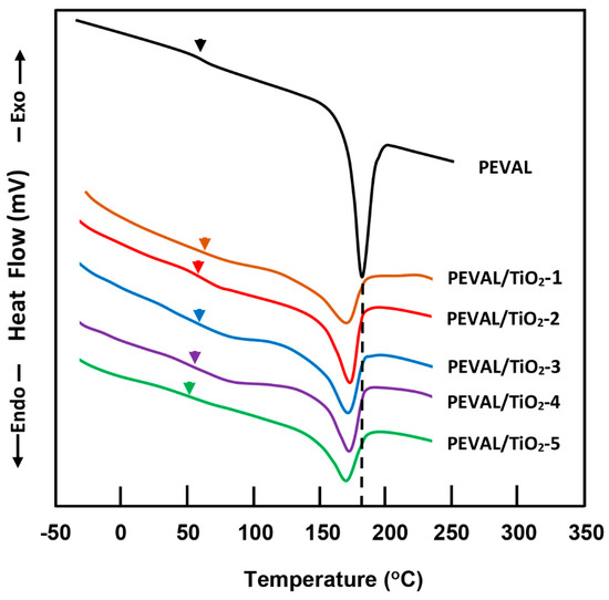 The DSC thermograms of PEVAL and PEVAL/TiO2 nanocomposites are grouped in Figure 3 and the glass transitions and melting temperatures deducted are gathered in Table 2. The thermal curve of neat PEVAL indicated 60, 184 °C and 66.78 J∙g−1 for the glass transition, the melting temperatures and the melting enthalpy, respectively, which agree with the literature regarding the same ethylene/vinyl alcohol composition [53]. However, for the PEVAL/TiO2 hybrid materials, these two properties shifted towards low temperatures, particularly the melting temperature (from 183 to 170 °C), which was also accompanied by a broadening of the melting peaks and a significant decrease in the heat of fusion of PEVAL. This reveals that the incorporation of TiO2 nanoparticles even in small quantities into the copolymer matrix considerably affected the thermal properties of PEVAL. This phenomenon is mainly due to the uniform dispersion of the TiO2 nanoparticles in the two copolymer structures (amorphous and crystalline). This increased the free volume between the polymer chains, leading to a decrease in the intensity of the interaction forces, mainly due to the hydrogen bonds between the chains of the PEVAL, leading to a decrease in its crystallinity, thus favoring the sliding of the chains on one another. Such phenomena have also been observed by other researchers studying similar nanocomposites [54,55].