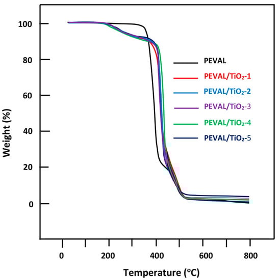 A TGA of virgin PEVAL and PEVAL/TiO2 hybrid materials was performed under dynamic nitrogen gas on a TGA/DSC1 Mettler–Toledo thermogravimeter (Columbus, OH, USA). Samples weighing between 10 and 14 mg were loaded into the TGA aluminum pan then heated from 25 to 800 °C at a heating rate of 20 °C·min−1.