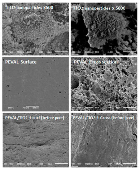 SEM images of TiO2 nanoparticles magnified 500 and 5000 times, showing the surface morphology and cross-section of pure PEVAL and a PEVAL/TiO2-1 nanocomposite film sample before pore connection.