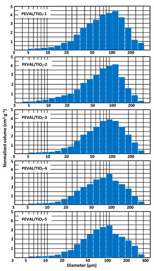 The results of the study of the porosity of the samples obtained by the pycnometer method are grouped in Table 3. These values indicate an average porosity of 82.76% for the sample containing 1% by weight of TiO2. This value decreased slightly with an increase in titanium oxide in the material. Similar results were also obtained using the poly(delta-valerolactone)/TiO2 system, which was attributed to the mechanical and thermal properties of this hybrid material [60]. Indeed, the decrease in the Tg value of the PEVAL with the increase in the TiO2 content in the composite observed by DSC analysis (from 62 to 53 °C) goes in the direction of increasing the flexibility of the resulting material. This promotes shrinkage of the pores under the action of the high vacuum created during the interconnection of the pores. As it can be seen from Figure 8, the pore size distribution in the PEVAL/TiO2 hybrid materials shows a wide pore size distribution, for which the maximum is between 30 and 120 μm for all compositions. As can be also observed in this figure, the presence of very small pores (<10 μm) can be a proof of the interconnection of the pores. The large distribution of pores sizes in these hybrid materials (4–200 μm), without a doubt, confirms the presence of a high percentage of interconnected pores. This confirms that the connection of the pores in these materials was indeed achieved by the disappearance of the walls separating the neighboring pores due to the high pressure exerted from the inside towards the outside of the pores subjected to the high vacuum during the porogen removal process.