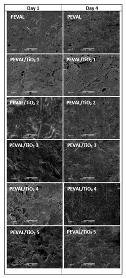 HGFs showed increased cellular activity across the different culture time points. The cell activity increased in all groups from Day 1 to Day 7; this increase was statistically significant, as shown in Figure 9. Higher cell activity in all test groups (PEVAL/TiO2 scaffolds) was observed compared with the cellular activity of HGFs cultured with the control group (virgin PEVAL). On Day 1, HGFs cultured with PEVAL filled with 1 wt% TiO2 showed superior bioviability compared with HGFs cultured with virgin PEVAL and PEVAL containing 2, 3, 4 and 5 wt% TiO2. As shown in Figure 10, this difference is statistically significant. On Day 4, HGF was seeded in the PEVAL/TiO2 system; whatever its composition, it showed an increase in cell viability compared with the results observed on Day 1, and this increase was statistically significant (Figure 10). However, HGFs cultured on PEVAL/TiO2 scaffolds containing 2 and 4 wt% TiO2 showed significantly higher cell activity than the other groups (Figure 10). As shown in this figure, the same pattern was observed on Day 7: all tested groups showed significantly higher cell viability compared with the control group on Day 7 (p < 0.002). HGFs’ attachment to the scaffolds was investigated using SEM. The SEM images (Figure 11) showed that the HGFs were successfully cultured on all scaffold types. On Day 1, the HGFs had already formed a homogeneous surface on all scaffolds; however, SEM images of HGFs cultured on PEVAL/1wt%TiO2 showed a denser cell layer compared with the other membranes. The same was observed on Days 4 and 7 (data not shown).