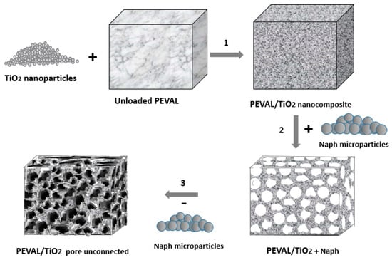 Hypothetical scheme depicting the preparation process of interconnected poly(ethylene-co-vinyl alcohol)/titanium dioxide using naphthalene. (1) Incorporation of TiO2 nanoparticles into the PEVAL matrix; (2) incorporation of Naph microparticles in the PEVAL/TiO2 nanocomposite; (3) removing the Naph microparticles by sublimation.