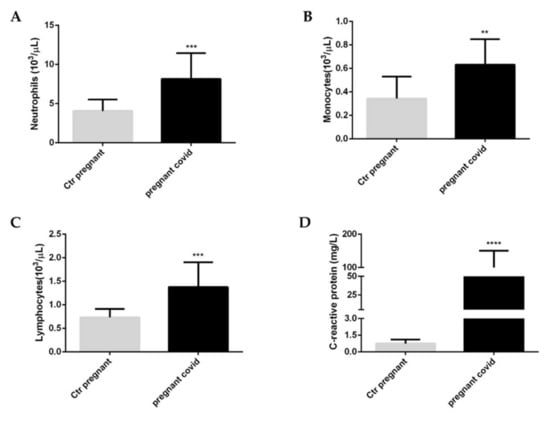 White blood cells and c-reactive protein in pregnant women with COVID-19. (A) Neutrophils, (B) Monocytes, (C) Lymphocytes, (D) C-reactive protein. The data are expressed as the means ± SDs. The significance was determined by the Student’s t-test: ** (p < 0.01), *** (p < 0.001), and **** (p < 0.0001) represent significance compared to Ctr pregnant (pregnant women not affected by COVID-19).