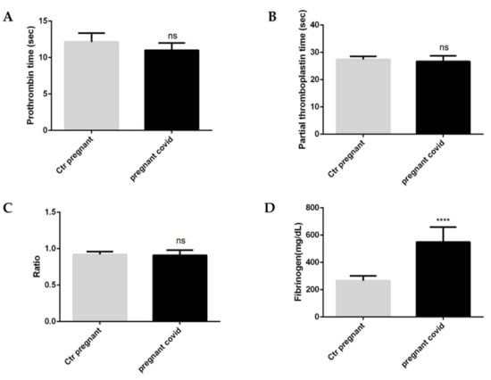 Coagulation parameters in pregnant women with COVID-19. (A) Prothrombin, (B) Partial thromboplastin, (C) Ratio, (D) Fibrinogen. The data are expressed as the means ± SDs. The significance was determined by the Student’s t-test: ns (not significant), **** (p < 0.0001) represent significance compared to Ctr pregnant (pregnant women not affected by COVID-19).