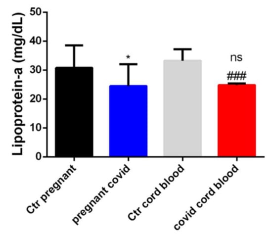 Evaluation of Lp(a) in serum and cord blood of mothers affected by COVID-19. The data are expressed as the means ± SDs. The significance was determined by the Student’s t-test: * (p < 0.05) represent significance compared to Ctr pregnant (pregnant women not affected by COVID-19), ### (p < 0.001) represent significance compared to Ctr cord blood (cord blood from pregnant women not affected by COVID-19), ns (not significant) represent significance compared to pregnant COVID (women affected by COVID-19).