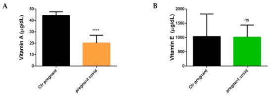 Dosage of Vitamin A and E. (A) Vitamin A. The data are expressed as the means ± SDs. The significance was determined by the Student’s t-test: **** (p < 0.0001) represent significance compared to Ctr pregnant (pregnant women not affected by COVID-19). (B) Vitamin E. The data are expressed as the means ± SDs. The significance was determined by the Student’s t-test: ns (not significant) represent significance compared to Ctr pregnant (pregnant women not affected by COVID-19).