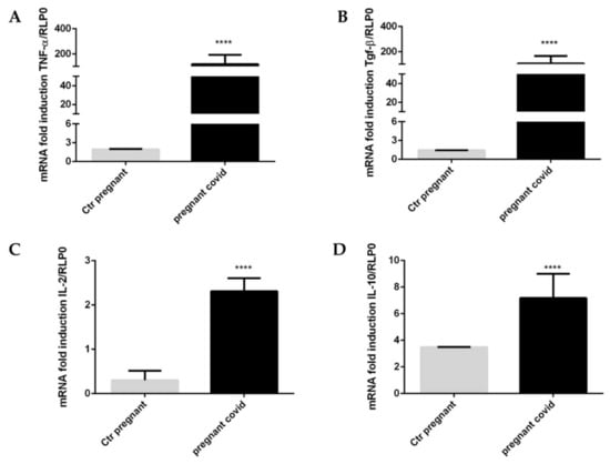 To underline the activation of the immune system of pregnant women affected by COVID-19, we evaluated the levels of gene expression of some cytokines. In particular, we have focused our attention on TNF-α, TGF-β, IL-2 and IL-10. The results obtained show a significant increase (p < 0.0001) of all four cytokines in pregnant patients with COVID-19 when compared with controls (Figure 5A–D). As can be seen from the graphs shown in Figure 5, TNF-α increases by 60 times compared to controls (Figure 5A), TGF-β increases 74-fold compared to controls (Figure 5B), IL-2 increases 8-fold (Figure 5C) when compared with the controls, and finally, IL-10 increases 2-fold when compared to the controls (Figure 5D).