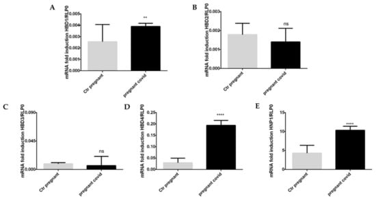 In light of these results, we can affirm that AMPs are essential in the activation of innate immunity when there is the presence of pathogenic microorganisms [,,,,]. So certainly the increase in gene expression of HBD1, HBD4 and HPN-1 in the maternal stage indicates that the maternal immune system is defending itself from the virus’s attack, while at the same time defending the fetus.
