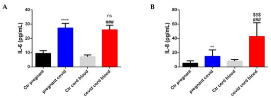 The level of IL-6 and IL-8 in serum and cord blood of mothers affected by COVID-19. The accumulation of cytokines was assessed by ELISA assay. The data are expressed as the means ± SDs. (A) IL-6 level. The significance was determined by Student’s t-test: **** (p < 0.0001), represent significance compared to Ctr pregnant (pregnant women not affected by COVID-19); ### (p < 0.001) represent significance compared to Ctr cord blood; ns (not significant) represent significance compared to pregnant COVID. (B) IL-8 level. The significance was determined by Student’s t-test: ** (p < 0.01), represent significance compared to Ctr pregnant (pregnant women not affected by COVID-19); ### (p < 0.001) represent significance compared to Ctr cord blood; $$$ (p < 0.001) represent significance compared to pregnant COVID.