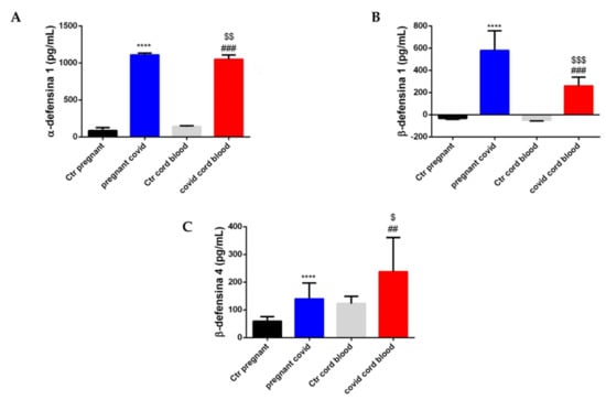 In conclusion, these results reveal a new scenario from both a diagnostic and therapeutic point of view. In fact, a serum increase in defensins would represent an alarm bell for any infections in progress, but on the other hand, it might be thought that the use of these AMPs in infusion—such as immunoglobulin—during infections with Cytomegalovirus [,,] could be an avant-garde therapy in the case of COVID-19 in pregnancy.