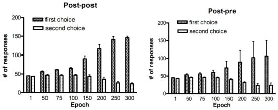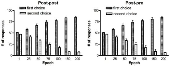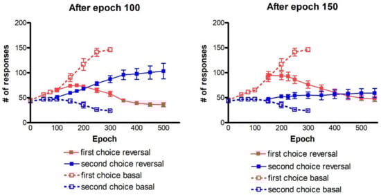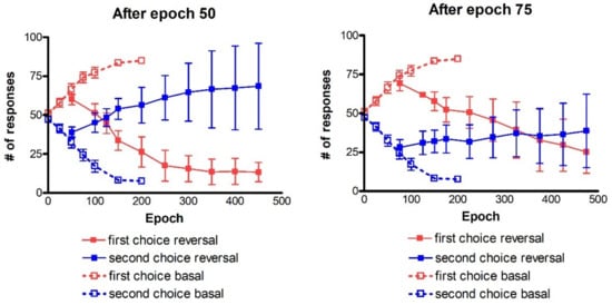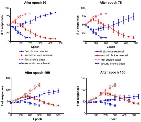 A summary of the entire history of the test performed after reversal training is given in Figure 6. It is worth recalling that the number of responses at epoch 1 after 50 and after 75 epochs (Figure 6) corresponds to that of Figure 2 at epoch 50 and at epoch 75, respectively, as that is when the reversal starts.
