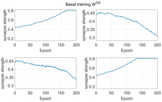 To better illustrate the training procedure, the effect of basal training on synapses coming from the sensory cortex (S) to the Go neurons, is given in Figure 3. We have chosen these synapses since they illustrate the relationship between the external context (S) and the chosen activity (Go). The first row of Figure 3 shows the temporal pattern of the synapses entering into the first channel; the second row represents synapses entering into the second channel. The columns represent the corresponding inputs. Since we more frequently rewarded the first action with the stimulus S1 = [1 0.3] given as input, and the second action with the stimulus S2 = [0.3 1], the network should be able to associate the first element of S with the first action, and the second element of S with the second action. Accordingly, the synapses on the main diagonal strengthen, whereas those out of the main diagonal weaken. This means that the agent can progressively discriminate between the two choices selecting the correct association (stimulus linked to the chosen action). The effect of saturation concerning the synapses on the main diagonal can be seen starting from epoch 170 and epoch 130, respectively. We must point out that synapses can’t overcome a saturation value of 0.8.