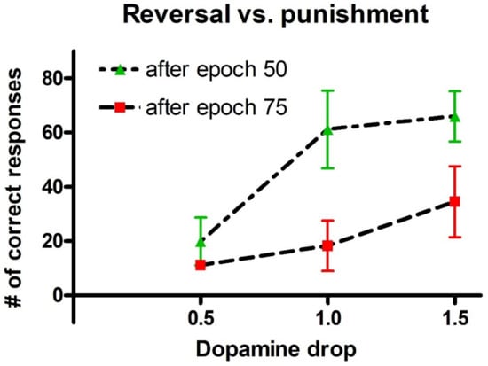 As described in the Section 4, after the training, we performed a reversal learning (by inverting the probability of reward for the two actions with each stimulus), starting from different epochs of previous training. In particular, we tested the case of a reversal learning performed after 50 epochs of basal training (moderate learning) and after 75 epochs of basal training (good learning). However, as shown in Figure 4, simulations demonstrated that, in order to reverse the choices, the punishment dopaminergic drop (Ddrop in Equation (6), in the Section 4) during reversal learning must be significantly stronger than the value used during the previous basal training. Figure 4 illustrates the results, where the dopamine drop used during the reversal learning (that is, the strength of punishment) is plotted on the x-axis, while the number of correct choices after 200 epochs of reversal learning are plotted on the y-axis.