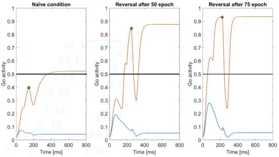 - We can assume that the activity of the Go neuron immediately before the punishment or reward (the level which is shown with an asterisk in Figure 5) represents an expectancy of the reward (or the probability of a reward, in fact, in our model the neuron activity is normalized between 0 and 1). If the winner Go neuron at the moment of the reward/punishment is close to 0.5 (which also represents the threshold for our Hebb rule), as in the left panel of Figure 5, the expectancy of reward is about 50%. A high value of the Go activity (as in the middle and left panels in Figure 5) signifies a high expectancy of a reward. This should be associated with a smaller dopamine peak in case of reward, but with a higher dopamine drop in case of punishment. Conversely, a low level of the Go activity in the winner channel represents a low expectancy of a reward, which should be associated with a higher dopamine peak or a smaller dopamine drop. goj(t) represents the activity of the Go neuron in the jth channel (j = 1,2 in case of a two-choice task, j = 1, 2, 3, 4 in case of a four-choice task). Hence, we can assume a reward expectancy (i.e., the estimated probability of a reward, say ) as follows:where w represents the winner channel, and the instant at which a reward/punishment is given (some examples are shown in Figure 5).