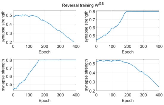All of these results are quite understandable since, during reversal learning, the agent must forget previous synapses and simultaneously reinforce the new ones. Indeed, looking at the synapse patterns in Figure 7, one can see that about 150–200 epochs are required before a significant decrease in the previously reinforced synapses.