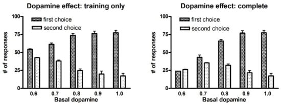 In the left panel, it is assumed that the tonic dopamine level is decreased during training, but a normal dopamine level is used during the test phase. This represents the case of a Parkinsonian subject, with a depletion in dopamine during training, who performs a test under levodopa medication (thus restoring the normal tonic dopaminergic level). It is evident that, if the tonic dopaminergic input is significantly decreased only during training (from 1.0 to 0.6), the agent responds in almost 100% of trials, but he/she is not able to discriminate between the first and second choices (first choice 54.4/100, second choice 42.5/100 when D = 0.6).