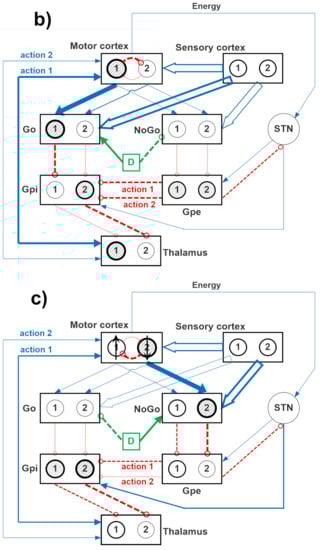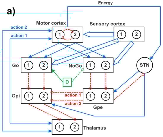 - Baston, C.; Ursino, M. A Biologically Inspired Computational Model of Basal Ganglia in Action Selection. Comput. Intell. Neurosci. 2015, 2015, 187417. [Google Scholar] [CrossRef]