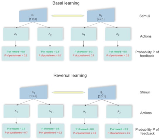 There is a large consensus in the literature that reversal learning involves at least two main brain structures, the basal ganglia (BG) and the prefrontal cortex, PFC (although amygdala and hippocampus are also involved in several tasks, see []). In particular, cortico-striatal synapses, which represent the initial projections of the BG processing stream linking the cortical structures to the striatum, experiment Hebbian plasticity in response to reward and punishments, a phenomenon mediated by dopamine phasic changes [,]. Neuroimaging studies illustrate the involvement of the dorsal [] and ventral [] regions of the striatum during reversal learning. Moreover, reversal learning is impaired in subjects with focal BG lesions [] and in parkinsonian subjects [,]; it is affected by levodopa administration, a dopamine precursor [] and by drug manipulation of D1 and D2 receptors [,,].