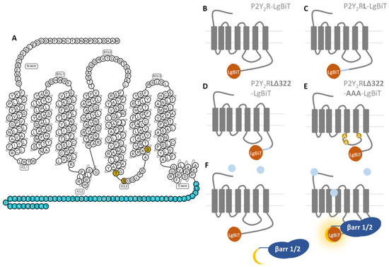 Schematic depiction of the experimental details of this manuscript. (A) P2Y2R snake plot (constructed on gpcrdb.org, last accessed 3 February 2022), with the residues removed in the truncated receptor constructs (Δ322) depicted in blue, and the mutated residues in IL3 (AAA) is shown in gold. Interaction with UTP supposedly occurs in the binding pocket generated by the upper parts of TM III, VI, and VII [22]. (B–E) Schematic overview of the generated receptor (mutant) constructs, with the exception of P2Y2RΔ322-LgBiT, which is C-terminally truncated but contains the original linker. (F) Schematic representation of the luminescence-based NanoBiT® functional complementation assay, where agonist interaction with the receptor leads to recruitment of βarr1/2, functional complementation of the LgBiT and SmBiT enzyme fragments, and a luminescent signal.