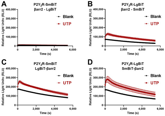 Selection of the optimal configuration of constructs of the P2Y2R and βarr2 in the NanoBiT® system. Each panel shows one of the four possible combinations of the P2Y2R, C-terminally fused to either LgBiT or SmBiT, and βarr2, C-or N-terminally fused to LgBiT or SmBiT: (A) P2Y2R-SmBiT with βarr2-LgBiT, (B) P2Y2R-LgBiT with βarr2-SmBiT, (C) P2Y2R-SmBiT with LgBiT-βarr2, (D) P2Y2R-LgBiT with SmBiT-βarr2. The combination with the strongest increase in signal upon addition of 100 µM of UTP was selected, being P2Y2R-LgBiT with SmBiT-βarr2. Data from one representative experiment (of three independent experiments) are shown, performed in quadruplicate.