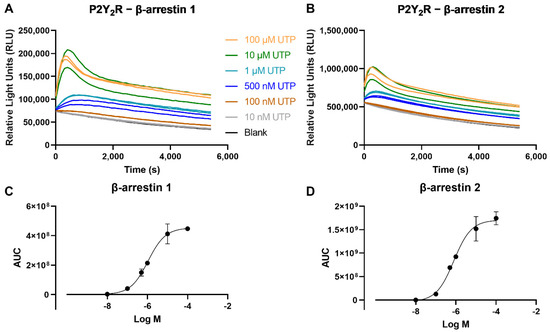 Time-luminescence curves of a concentration range of the reference agonist UTP in the NanoBiT® system, monitoring the recruitment of (A) βarr1, or (B) βarr2 to the P2Y2R. Data shown are of one representative experiment out of three independent experiments, of which each condition was performed in duplicate. Panels (C,D) depict the corresponding sigmoidal concentration-response curves, with data points represented as mean ± SEM (standard error of the mean).