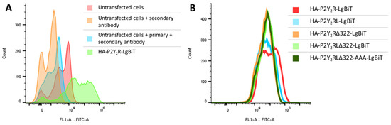 Upon verification of the concentration dependence, certain adaptations were introduced into the P2Y2R-LgBiT construct to assess the influence on its ability to recruit βarr1 and βarr2. Hence, the following constructs were generated, with an increasing number of modifications: P2Y2RL-LgBiT (with a shorter linker, in which the phosphorylatable serine residues are removed); P2Y2RΔ322-LgBiT and P2Y2RLΔ322-LgBiT (in which the C-terminal tail of the GPCR is truncated); and P2Y2RLΔ322-AAA-LgBiT (in which three serine/threonine residues in IL3 are mutated to alanine). For optimal comparability of the results obtained with the different receptor constructs in the NanoBiT® system, correct expression at the cell surface of the HA-tagged constructs was first confirmed via flow cytometry (Figure 4). Panel A shows the result of a control experiment where signals obtained for cells transfected with HA-tagged P2Y2R-LgBiT were compared to ‘negative control’ cells (non-transfected cells without antibody, with only a secondary (labeled) antibody, or with a primary and a secondary antibody). From this panel, it can be derived that the cells transfected with HA-tagged construct indeed gain a higher fluorescence intensity than the untransfected cells. Panel B then shows the assessment of the surface expression of the different HA-tagged P2Y2R constructs. To this end, the fluorescence (FITC) intensity for the cells that were positive for the mTurquoise transfection control (in contrast to the cells shown in panel A, which shows non-selected cells) is shown for each of the five generated constructs. As can be seen in panel B, the signals for all tested conditions largely overlap, indicating the similar surface expression of each of the generated HA-tagged P2Y2R-constructs in the NanoBiT® system.