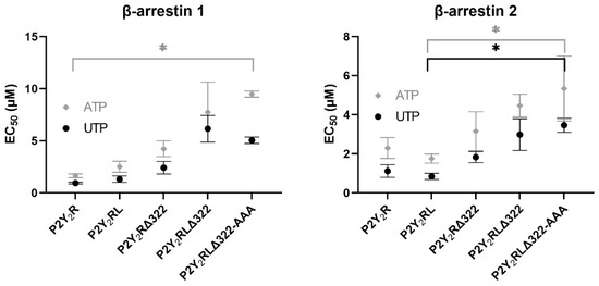 Visual representation of the obtained EC50 values, as a measure of the potency of either UTP or ATP to induce the recruitment of βarr1 or βarr2 to the (modified) P2Y2R constructs in the NanoBiT® system. Data are ± SEM (standard error of the mean) of three independent experiments, each performed in duplicate. * p < 0.05, as assessed in a Kruskal–Wallis analysis with post hoc Dunn’s.