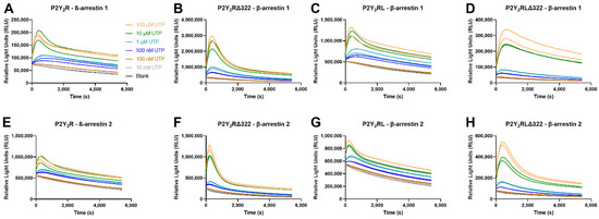 In addition to the numerical EC50 values, the continuous live cell readout also allows for the generation of real-time time-luminescence profiles. A closer look at these profiles revealed a remarkably different course for the curves obtained with full length P2Y2R constructs as compared to C-terminally truncated P2Y2R constructs. This is obvious from Figure 6, comparing the βarr1 (panels A–D) and βarr2 (panels E–H) recruitment to P2Y2R-LgBiT and P2Y2RΔ322-LgBiT (panels A versus B; or E versus F) upon stimulation with the reference agonist UTP. A more plateau-like shape is obtained for the former (wt) than for the latter (truncated) P2Y2R. This dissimilarity in profile course was also observed when comparing P2Y2RL-LgBiT and P2Y2RLΔ322-LgBiT (panels C versus D; or G versus H), or when focusing on ATP (for which the profiles are provided in Supplementary Figure S1). The Figures reflect the least plateau-like profile for the truncated P2Y2RΔ322-LgBiT construct, with a stronger effect of this truncation on the profile of βarr2 than on βarr1, with both of the endogenous agonists.