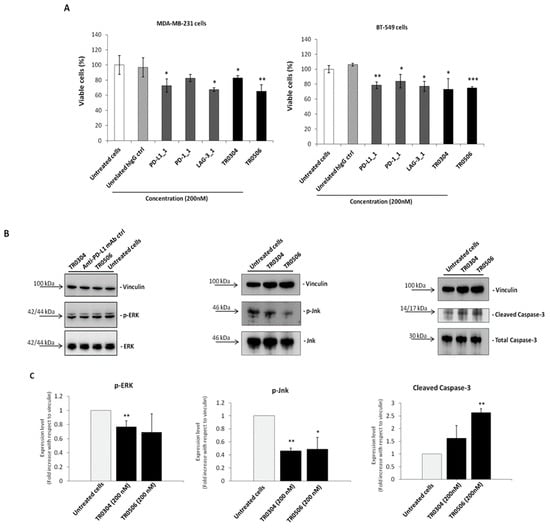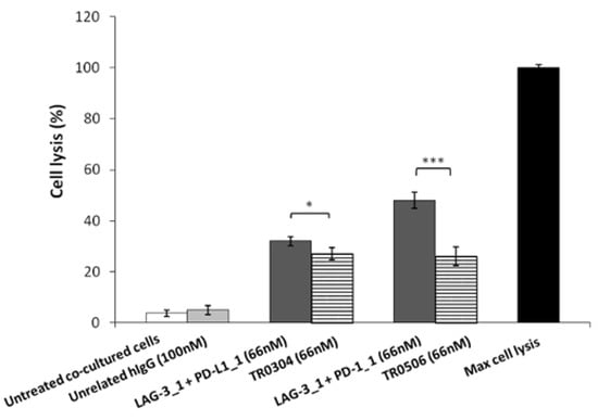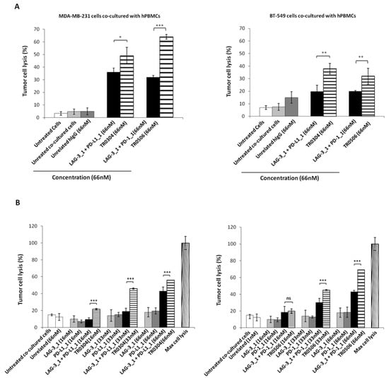 2.8. In Vitro Cytotoxic Effects of Tribodies on Breast Tumor Cells Co-Cultured with Human Lymphocytes