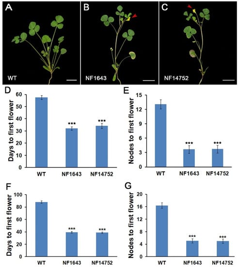 To study the regulation mechanism of flowering in M. truncatula, a Tnt1 retrotransposon-tagged mutant population was screened []. Two independent mutant lines, NF1643 and NF14752, with the early flowering phenotype were identified (Figure 1A–C). Under long-day conditions (LDs), the flowering time of mutants (32.1 ± 1.4 d of NF1643 and 34.2 ± 2.0 d of NF14752 after seed germination) was advanced by 3–4 weeks, compared to that of the wild-type (57.6 ± 1.65 d after seed germination) (Figure 1D). The first flower was observed on the 3rd or 4th node on the primary shoot axis in the mutants but appeared on the 13th node in the wild-type (Figure 1E). In addition, the mutants also flowered significantly earlier than the wild-type plants in short-day conditions (SDs) (Figure 1F,G), indicating that flowering time in the mutants was accelerated under both LDs and SDs.