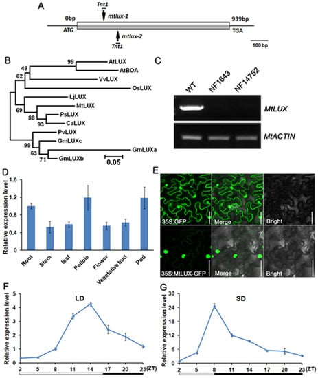 Molecular cloning and expression pattern of MtLUX in M. truncatula. (A) Schematic representation of the MtLUX gene structure and Tnt1 insertion site. Box represents exon and lines represent 5′ and 3′-UTRs. (B) A neighbor-joining tree of MtLUX and LUX orthologs from other species including A. thaliana (AtLUX and AtBOA), Oryza sativa (OsLUX), Vitis vinifera (VvLUX), Cicer arietinum (CaLUX), Phaseolus vulgaris (PvLUX), Pisum sativum (PsLUX), Lotus japonicus (LjLUX), and Glycine max (GmLUXa, b and c). (C) RT-PCR analysis of full-length transcript of MtLUX in the WT and mtlux mutants. Actin was used as the control. (D) The expression level of MtLUX in different organs. MtUBIQUITIN was used as the internal control. Values are shown as means ± SD of three biological replicates. (E) The subcellular localization of MtLUX-GFP fusion proteins. Free GFP as the control. Bars = 50 um. (F,G) MtLUX transcript levels in long-day (16 h light/8 h dark) (F) and short-day (8 h light/16 h dark) conditions (G) in 4-week-old WT plant. MtUBIQUITIN was used as the internal control. Values are shown as means ± SD of three biological replicates. White and black bars at the bottom indicate periods of light and dark, respectively.