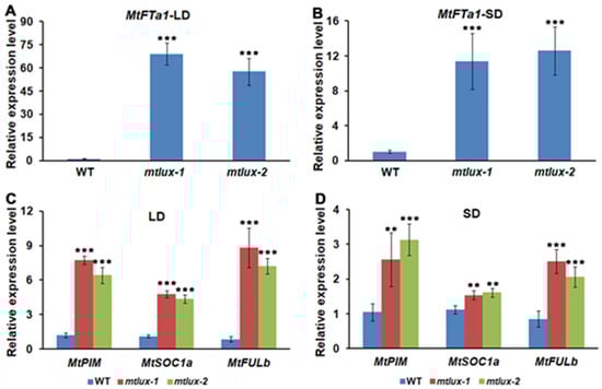 To investigate the mechanism of the early-flowering phenotype observed in the mtlux mutant (Figure 1), the expression level of MtFT was analyzed. Among the five characterized FT-like genes in M. truncatula, MtFTa1 is a key regulator of flowering time []. The abundance of the MtFTa1 transcript was markedly elevated in the leaves of mtlux, compared to that in the wild-type in LDs, SDs, and constant light conditions (Figure 3A,B and Figure S4A). This result suggested that the early flowering defects in mtlux may be induced by the ectopic expression of MtFTa1 under different growth conditions. Furthermore, the transcript level of several flowering control genes was examined. MtSOC1a and MtFULb were selected because that they are the target genes of MtFTa1, and can be induced in MtFTa1 over-expressing plant []. Additionally, the marker gene of the floral transition, MtPIM, was also chosen for analysis. The results showed that the transcriptional abundance of three genes was significantly increased in the leaves of the mtlux mutant (Figure 3C,D), which further confirmed the role of MtFTa1 in the early flowering phenotype of mutants.