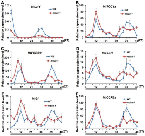 The expression pattern of MtLUX exhibited a diurnal and circadian rhythm, implying that MtLUX may play a role in maintaining normal clock rhythmicity. To confirm this hypothesis, the rhythmic expressions of several clock genes including MtLHY, MtTOC1a, MtPRR5/9, MtPRR7, MtGI, and MtCCR2a were analyzed in the wild-type and mtlux-1 mutant under constant light conditions for 2 d (Figure 4). The results showed that the circadian clock genes maintained the robust rhythmic cycles in the mtlux-1 mutant in the first day. However, on the second day, the waveforms were rough, and the amplitudes were reduced with an obvious phase advance of approximately 3 h in the mtlux-1 mutant, displaying a period shortening effect. These observations indicated that the expression of circadian clock genes is severely compromised in the mtlux mutant under constant light conditions, suggesting the potential role of MtLUX in controlling the clock rhythmicity. Moreover, the abundance of MtLHY was significantly decreased throughout the daytime, particularly at the peak time (Figure 4A), and the repression of MtLHY is also consistent with the short period phenotype of the mtlux-1 mutant. Conversely, the expression levels of MtTOC1a, MtPRR5/9, MtPRR7, MtGI, and MtCCR2a were higher in the mtlux-1 mutant than those in the wild-type at the most time points during the first day (Figure 4B–F), implying the different regulatory roles of MtLUX in circadian components.