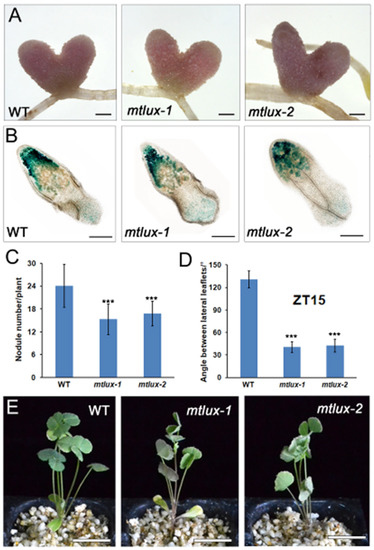 Wild-type and mtlux mutant plants were grown in a mixture of pearlite/sand (3:1 ratio) under a 16 h photoperiod at 22 °C with a relative humidity from 60–70% and a light intensity of 90 μmol/m2/s. The S. meliloti strain 1021 was incubated in TY medium supplemented with 6 mM CaCl2, 200 μg/mL streptomycin and 10 μg/mL tetracycline and shaken at 28 °C overnight until the OD600 value reached to 1.0. Three days after sowing, the seedlings were inoculated with 5 mL of S. meliloti 1021 strain suspension insufficient water of OD600 of 0.1. After 3 weeks, the nodules were counted, and leaf angles were recorded. The LacZ activity of nodules was performed as previously described [].