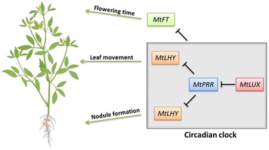 - Kong, Y.; Han, L.; Liu, X.; Wang, H.; Wen, L.; Yu, X.; Xu, X.; Kong, F.; Fu, C.; Mysore, K.S.; et al. The nodulation and nyctinastic leaf movement is orchestrated by clock gene LHY in Medicago truncatula. J. Integr. Plant Biol. 2020, 62, 1880–1895. [Google Scholar] [CrossRef]