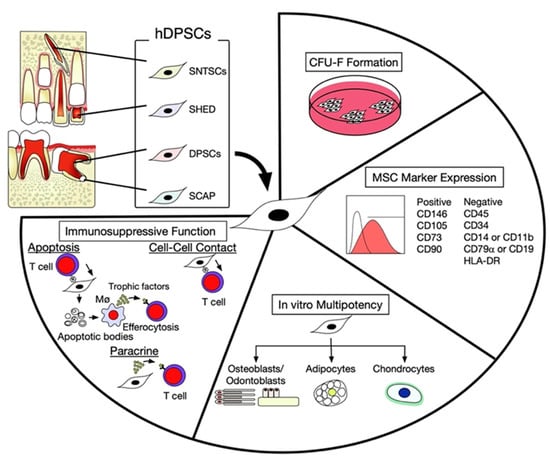 - De la Rosa-Ruiz, M.D.P.; Álvarez-Pérez, M.A.; Cortés-Morales, V.A.; Monroy-García, A.; Mayani, H.; Fragoso-González, G.; Caballero-Chacón, S.; Diaz, D.; Candanedo-González, F.; Montesinos, J.J. Mesenchymal stem/stromal cells derived from dental tissues: A comparative in vitro evaluation of their immunoregulatory properties against T cells. Cells 2019, 8, 1491. [Google Scholar] [CrossRef] [PubMed]