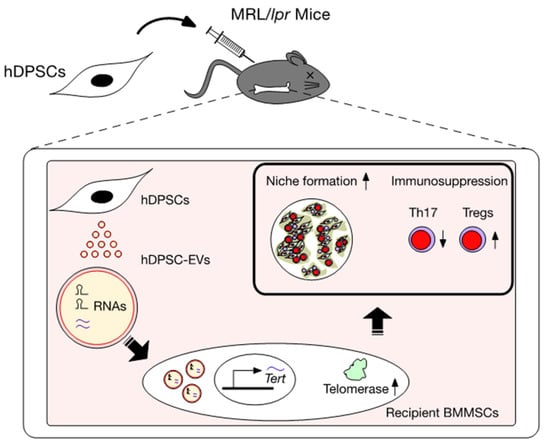 Collectively, recent findings indicate that cell–cell communication via multiple RNA(s) within hDPSC-EVs released from hDPSCs is involved in the therapeutic mechanism of the systemic transplantation of hDPSCs in SLE MRL/lpr mouse models. The RNA(s) within hDPSC-EVs target recipient BMMSCs to epigenetically regulate the expression of the Tert gene. This enhances hematopoietic niche formation and rescues the immune microenvironment associated with revitalized Tert-associated telomerase activity. These findings provide novel insights into the mechanism of hDPSC-based therapy, revealing that intercellular communication between donor-derived cells and recipient cells plays a vital role in recovering the recipient pathological niche.