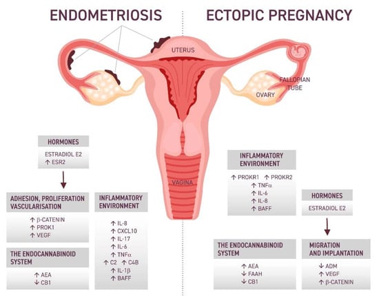Dobovišek et al. suggested that estrogen signaling may be related to the action of cannabinoids in the treatment of ESR-expressing breast cancer [76]. So far, there are no clinical trials on the effects of cannabinoids in both endometriosis and EP, but their potential role in the pathogenesis of these diseases is worth summarizing.