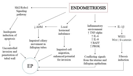 Inflammation induction can also be caused by B-cell activation factor (BAFF), which regulates acquired and innate immune responses. Increased BAFF expression with simultaneous increases in IL-6 and TNF-alpha levels was observed in patients with TEP [45]. In addition, Hever et al. confirmed that BAFF was elevated in the endometriotic lesions and in the serum of the patients with endometriosis compared to the control [46]. Based on the above results, it can be concluded that inflammatory factors have a significant influence on the pathogenesis of TEP, which may be the reason for the more frequent occurrence of ectopic pregnancy in women with endometriosis. Lekovich et al. observed a correlation between elevated serum levels of interleukin-1β and more frequent occurrence of EP [47]. In turn, Shi et al. showed that higher concentrations of IL-1β in patients with endometriosis led to an increase in WEE1 protein kinase, which is responsible for the induction of fibrosis. Moreover, they reported that WEE1 overexpression has been associated with a significant increase in ß-catenin, hence the supposition that abnormal inflammatory patterns may affect the expression of adhesion molecules via the Wnt/ß-catenin pathway [48].
