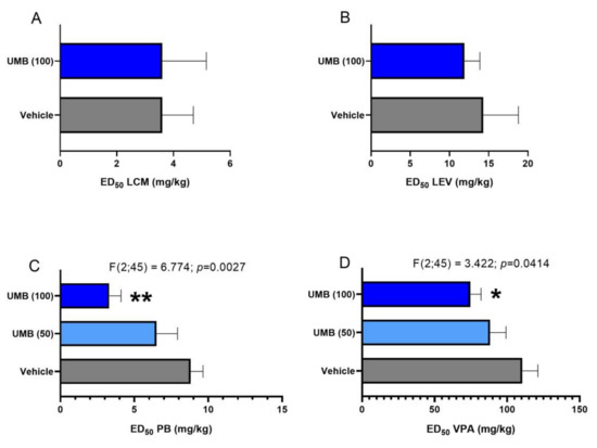 Figure 1. (AD) Effects of UMB on the anticonvulsant potency of CBZ, LCM, LTG and VPA in the 6 Hzcorneal-stimulation-induced seizure model in mice. Columns represent median effective doses (ED50 in mg/kg ± SEM) of antiepileptic drugs (LCM (A), LEV (B), PB (C) and VPA (D)) that protected half of the tested mice from psychomotor seizures. The log-probit method was used for calculating the ED50 values (each experimental group consisted of 8 mice). ** p < 0.01, * p < 0.05 vs. control (PB, VPA + vehicle-treated) animals (one-way ANOVA and post-hoc Tukey–Kramer test).