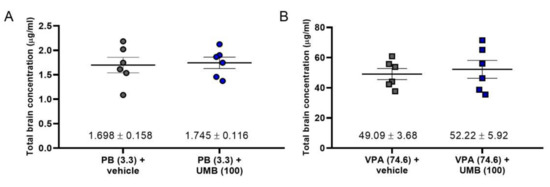 Figure 2. (A,B) Influence of UMB on total brain concentrations of classical ASMs in mice. Scatter plots represent total brain concentrations of PB and VPA in µg/mL (as means ± SEM, as the error bars; n = 6 mice/group). No statistical significance between the means was observed (unpaired Student’s t-test).
