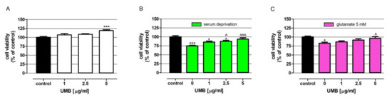 Figure 3. Influence of UMB on the viability of neurons under standard or degenerative conditions: trophic stress (serum deprivation) and glutamate excitotoxicity (5 mM glutamate). Neurons derived from human neuroblastoma cell line SH-SY5Y were exposed for 48 h to UMB at concentrations 1, 2.5 and 5 μg/mL prepared in culture medium alone (control) (A), or serum-deprived cell culture medium (B) or with 5 mM glutamate (C). Cell viability was measured photometrically using an MTT assay. Results are presented as the mean of at least 4 measurements. Statistically significant differences compared to the control at * p < 0.05, *** p < 0.001; statistically significant differences compared to the degenerative conditions at ^ p < 0.05, ^^^ p < 0.001. One-way ANOVA test and Tukey’s post-hoc test.