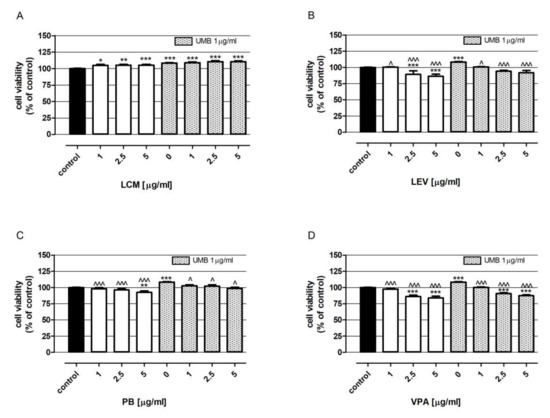 Figure 4. UMB impact on the biological activity of LCM (A), LEV (B), PB (C) and VPA (D) in neurons derived from human neuroblastoma cell line SH-SY5Y. Cells were exposed for 48 h to investigated drugs at concentrations 1, 2.5, and 5 μg/mL prepared with or without 1 μg/mL UMB. The control consisted of cells exposed to culture medium alone. Cell viability was measured photometrically using an MTT assay. Results are presented as the mean of at least 4 measurements. Statistically significant differences compared to the control at * p < 0.05, ** p < 0.01, *** p < 0.001;statistically significant differences compared to the UMB at ^ p < 0.05, ^^^ p < 0.001. One-way ANOVA test and Tukey’s post-hoc test.