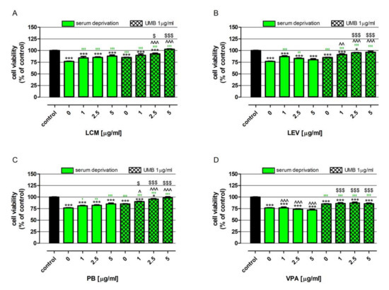 Figure 5. UMB impact on the biological activity of LCM (A), LEV (B), PB (C) and VPA (D) in neurons under trophic stress (serum deprivation) conditions. Neurons derived from human neuroblastoma cell line SH-SY5Y were exposed for 48 h to investigated drugs at concentrations 1, 2.5, and 5 μg/mL prepared in serum-deprived medium with or without 1 μg/mL UMB. The control consisted of cells exposed to culture medium alone. Cell viability was measured photometrically using as MTT assay. Results are presented as the mean of at least 4 measurements. Statistically significant differences compared to the control at * p < 0.05, *** p < 0.001; statistically significant differences compared to the UMB at ^ p < 0.05, ^^ p < 0.01, ^^^ p < 0.001; statistically significant differences compared to the serum-deprivation medium at ′ p < 0.05, ″ p < 0.01, ‴ p < 0.001; statistically significant differences between neurons treated with drug vs. neurons exposed to both UMB and drug at the corresponding concentrations at $ p < 0.05, $$$ p < 0.001. One-way ANOVA test and Tukey’s post-hoc test.