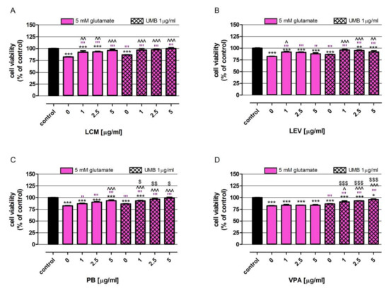Figure 6. UMB impact on the biological activity of LCM (A), LEV (B), PB (C) and VPA (D) in neurons under glutamate excitotoxicity conditions. Neurons derived from human neuroblastoma cell line SH-SY5Y were exposed for 48 h to investigated drugs at concentrations 1, 2.5, and 5 μg/mL in glutamate medium (5 mM glutamate), with or without 1 μg/mL UMB. The control consisted of cells exposed to culture medium alone. Cell viability was measured photometrically using an MTT assay. Results are presented as the mean of at least 4 measurements. Statistically significant differences compared to the control at * p < 0.05, ** p < 0.01, *** p < 0.001; statistically significant differences compared to the UMB at ^ p < 0.05, ^^ p < 0.01, ^^^ p < 0.001; statistically significant differences compared to the glutamate medium at ″ p < 0.01, ‴ p < 0.001; statistically significant differences between neurons treated with drug vs. neurons exposed to both UMB and drug at the corresponding concentrations at $ p < 0.05, $$ p < 0.01, $$$ p < 0.001. One-way ANOVA test and Tukey’s post-hoc test.